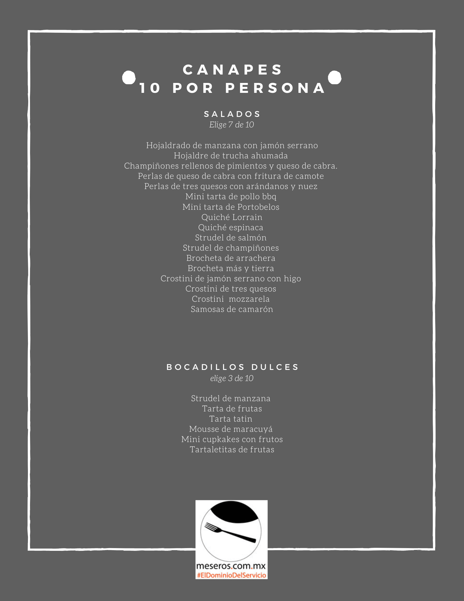 | Canapes | Canapes, Canapes + 2 copas de vino, Vaso individual charcuteria, Vaso individual charcuteria + 2 copas de vino |